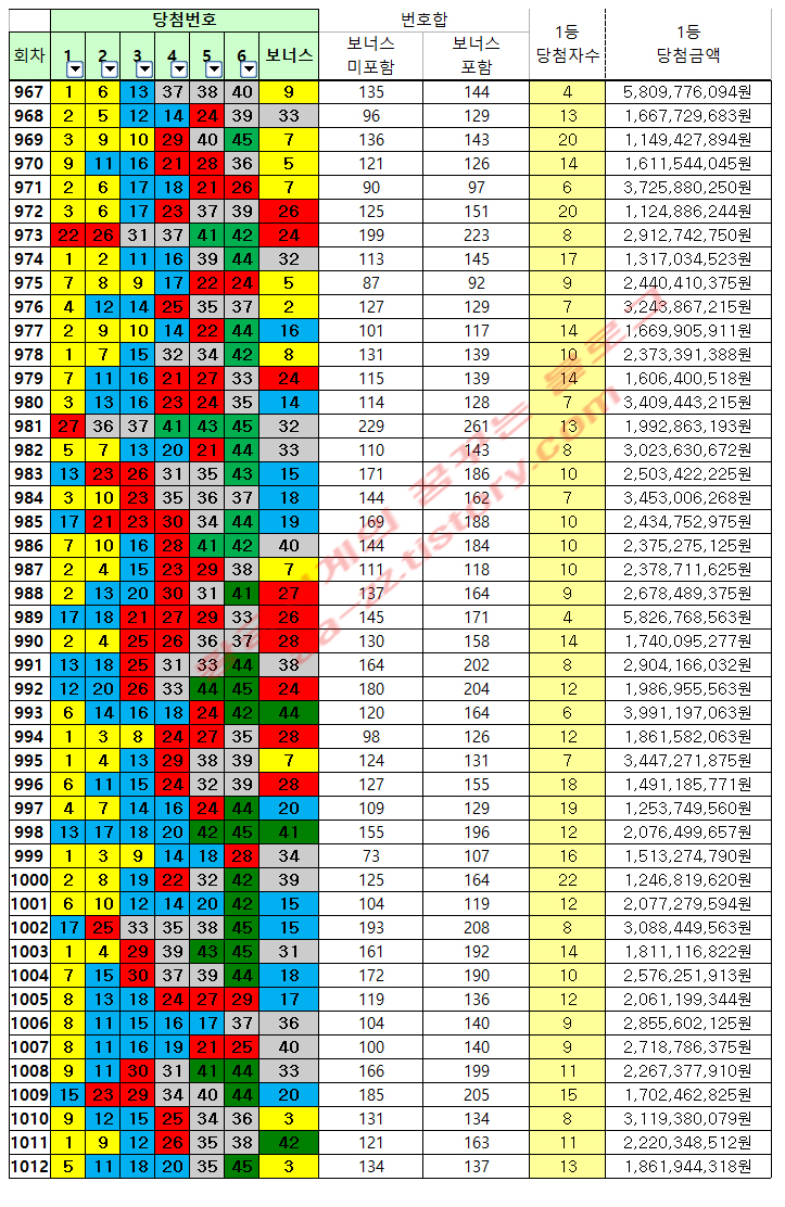 | 회차 | 당첨번호 | 번호합 | 1등 당첨자수 |